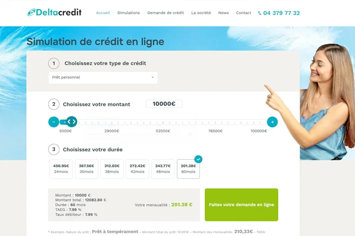 Avec Deltacredit, vous pouvez simuler facilement votre prêt en ligne. Ce service, accessible à tout moment, vous permet de choisir le type de prêt qui vous convient le mieux : Regroupement de crédit, prêt personnel, prêt travaux, prêt énergie, financement de véhicule, et bien d’autres. Grâce à la simulation, il suffit d’indiquer le montant et la durée souhaités pour obtenir immédiatement une estimation de vos mensualités. Cette démarche ne prend que quelques minutes et ne vous engage à rien.